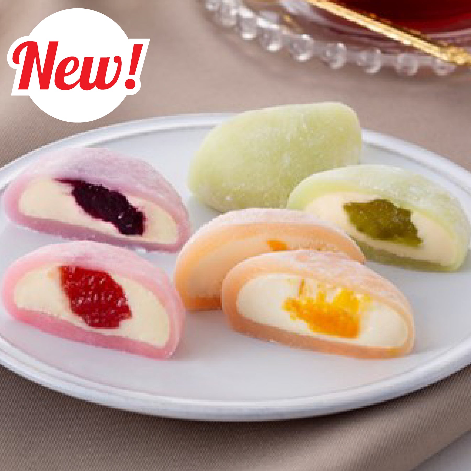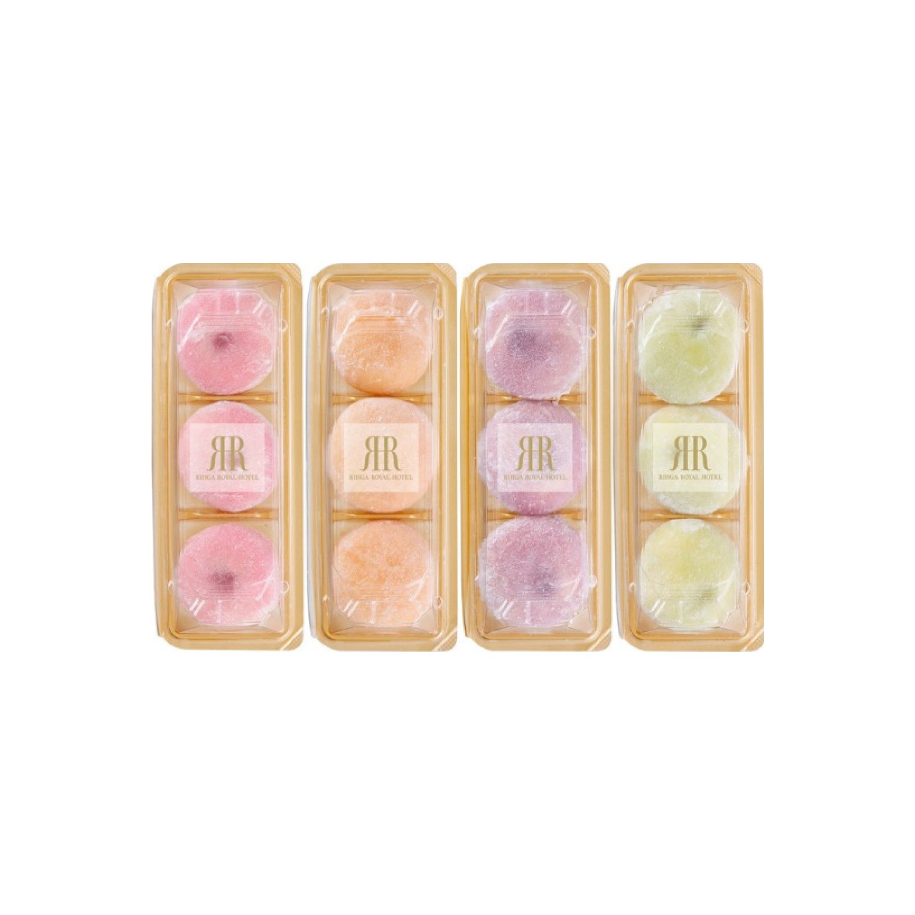 リーガロイヤルホテル監修の、北海道マスカルポーネチーズを使用。日本産シャインマスカット、福岡県産あまおうイチゴ、マンゴー、ブルーベリーのジャムを甘さ控えめの滑らかな触感のもちもち大福生地で大切に包み込みました。